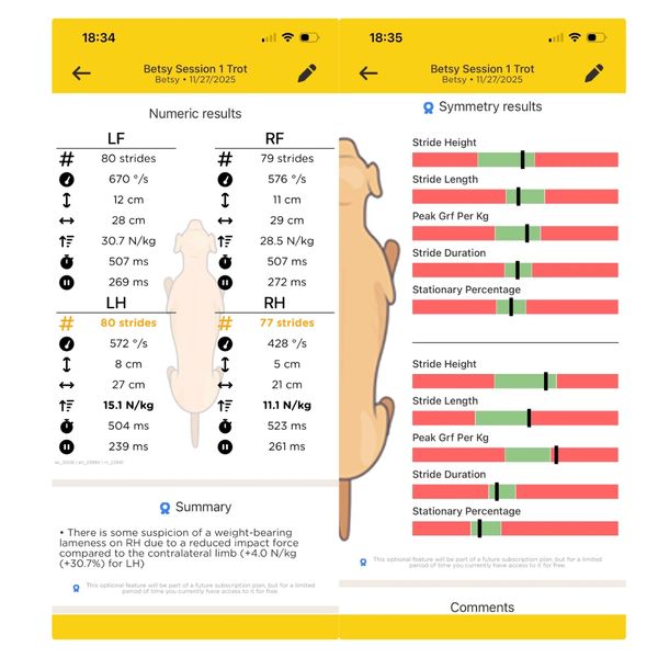 A gait analysis session is an excellent way to identify potential issues early, manage conditions and promote better mobility. The insights gathered provide a deeper understanding of how your dog moves, empowering you to make informed decisions about their care and treatment in collaboration with your vet or other professionals supporting their wellbeing. A gait analysis session includes;